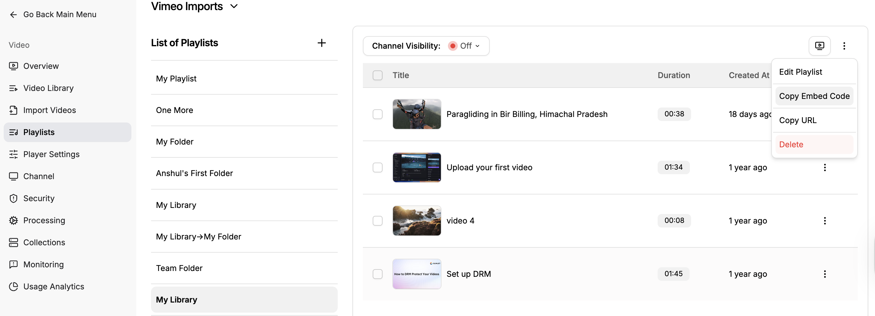 Your playlist embed will use the same settings as your player in the video library. Any changes you make there will be applied here automatically.