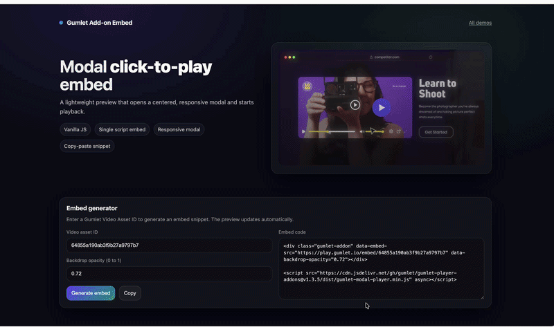 <script src="https://cdn.jsdelivr.net/gh/gumlet/[email protected]/dist/gumlet-modal-player.min.js" async></script>