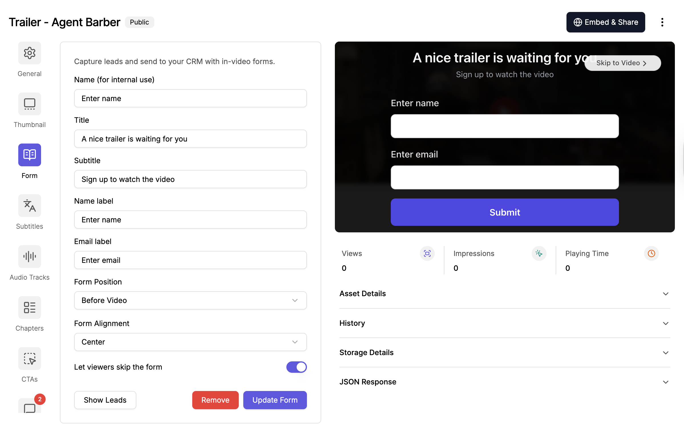 The lead capture in videos allow you to capture viewer's info and use that in your CRM or marketing tool for communication (offers, ads, branding).