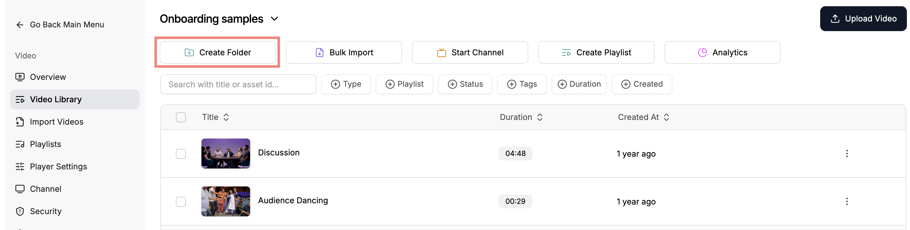 Create folders to organize videos neatly in your video library. You can also create nested folders to group related videos, separate projects or categories, and keep your entire library structured and easy to navigate.