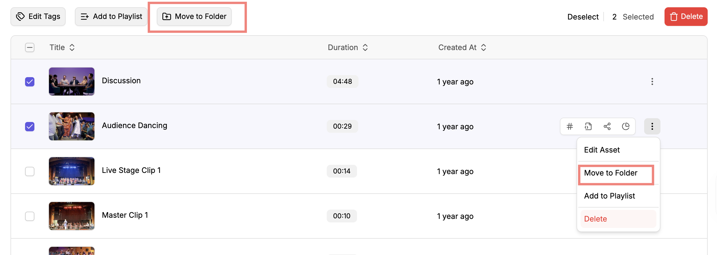 Note: Deleting a folder will delete all the items inside that folder, i.e., all the nested folders and assets.