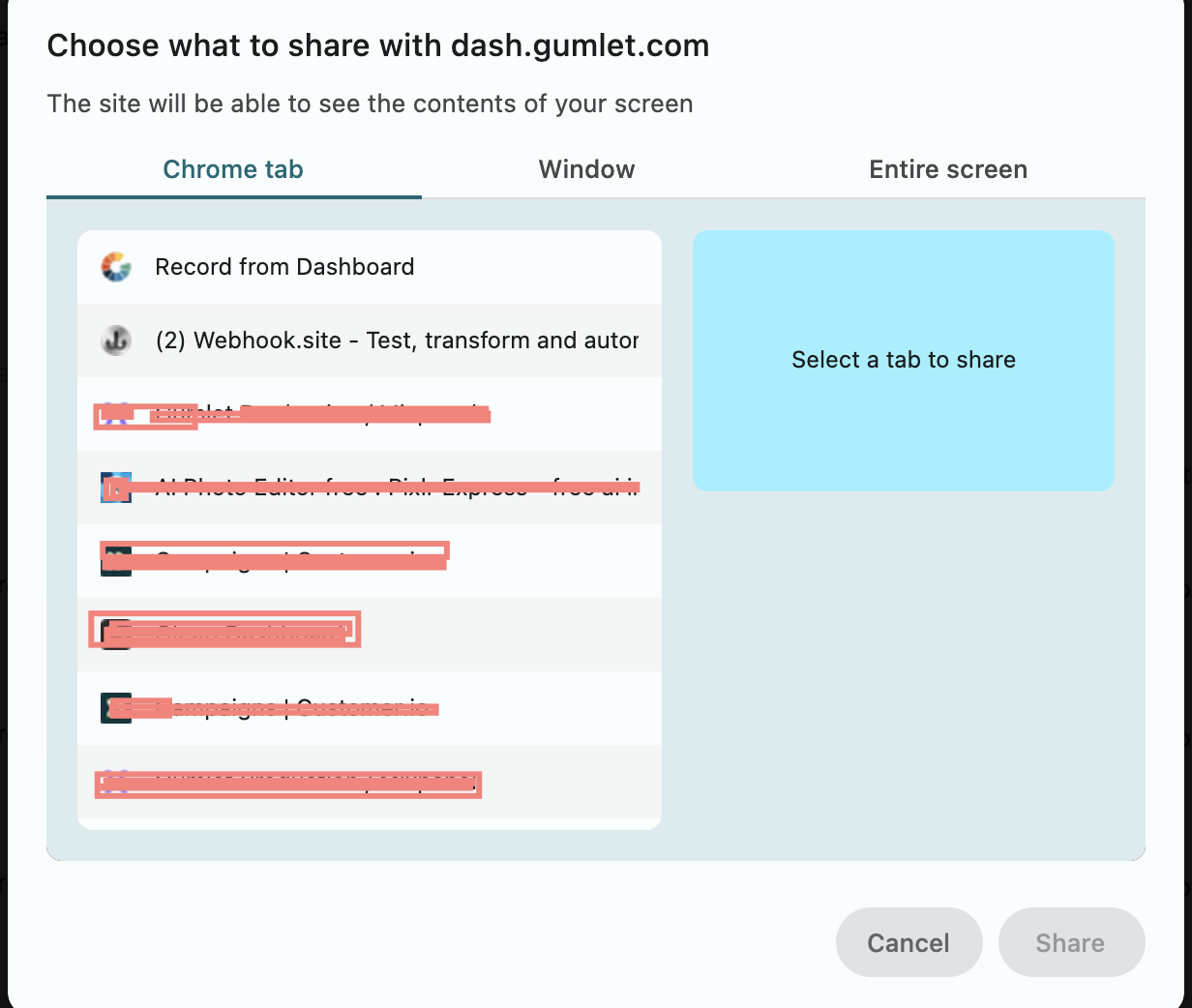 Click on Start Recording. Please give the prompt screen-sharing access. You can choose a tab, a window, or full screen.