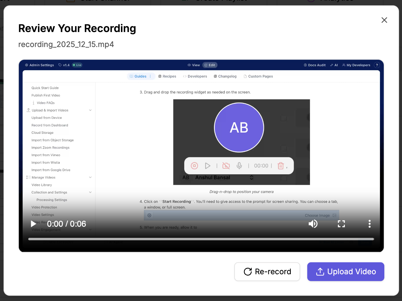 When you are done, you can stop the recording from the widget. Review the recording before uploading to Gumlet.