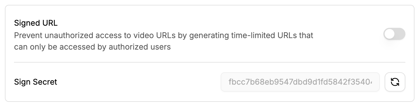 When enabled, this option provides a 16-byte hexadecimal sign secret key to generate a secure token and an expiration timestamp (Expiration time should be at least the duration of the Video Asset or the expected period). Video playback URLs under the video workspace will only be accessible with correctly generated tokens by the secret key and within the expiration time. When the signed URL expires, the URL will no longer be playable, even if playback has already started. The code snippets convert the ordinary Gumlet playback URL into a signed URL.