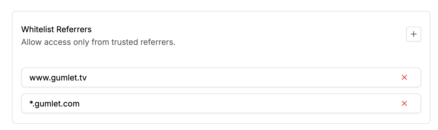 If you want to whitelist multiple subdomains, you can use wildcard(*). For e.g., *.gumlet.com will allow you to play videos across all subdomains of Gumlet.com
