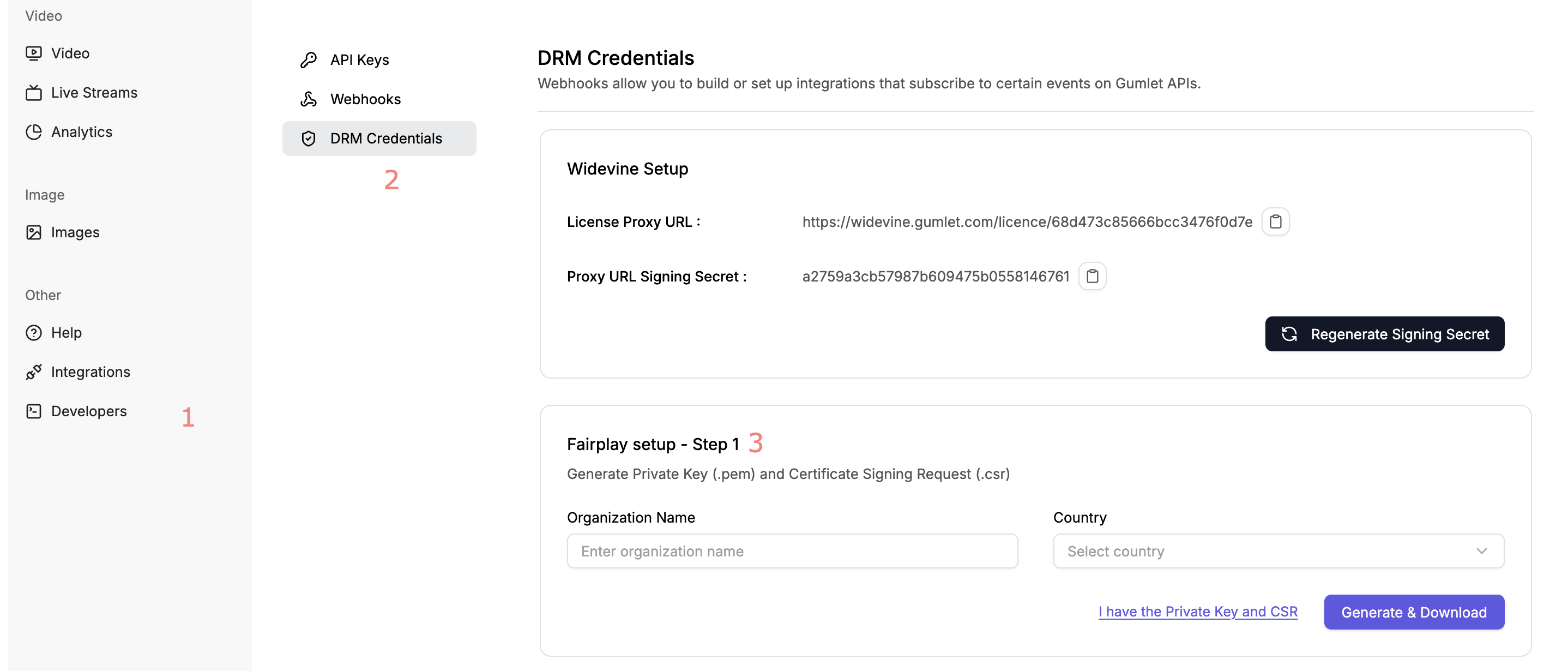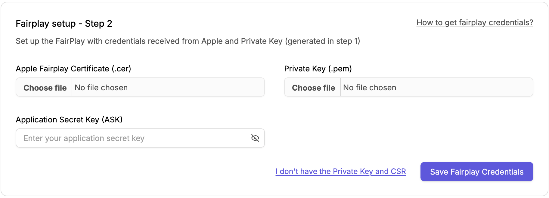 To add your Fairplay Credentials to Gumlet, go to the DRM Credentials page on the Gumlet dashboard. Upload Fairplay certificate (fairplay.cer
